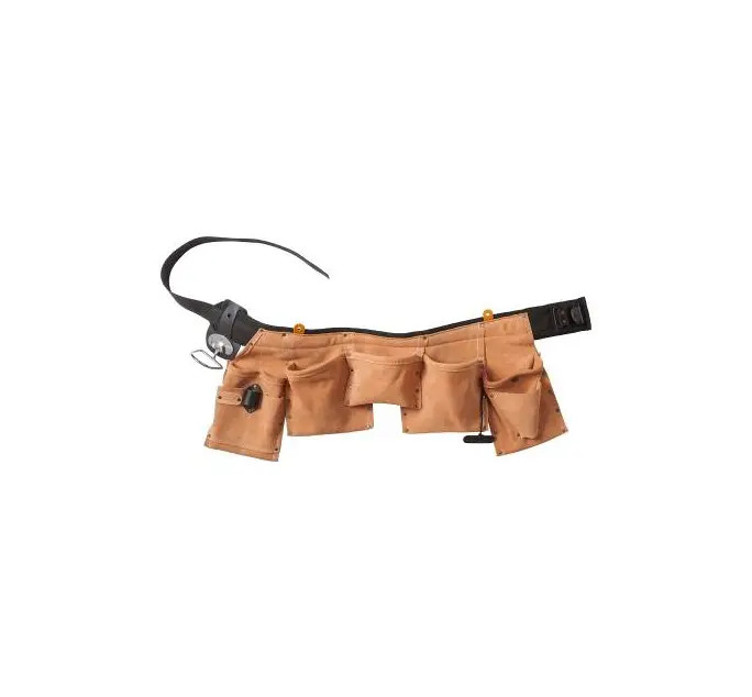 För elektriker, plåtslagare, montörer, snickare m fl. 3 spik-, skruvfickor. 7 verktygsfack, vänstra verktygsfickan kan även användas som spikficka. Hammarhållare i svart läder. Knivhållare. Nitförstärkt med spänne i metall. 70 mm polstrad mjukrem.